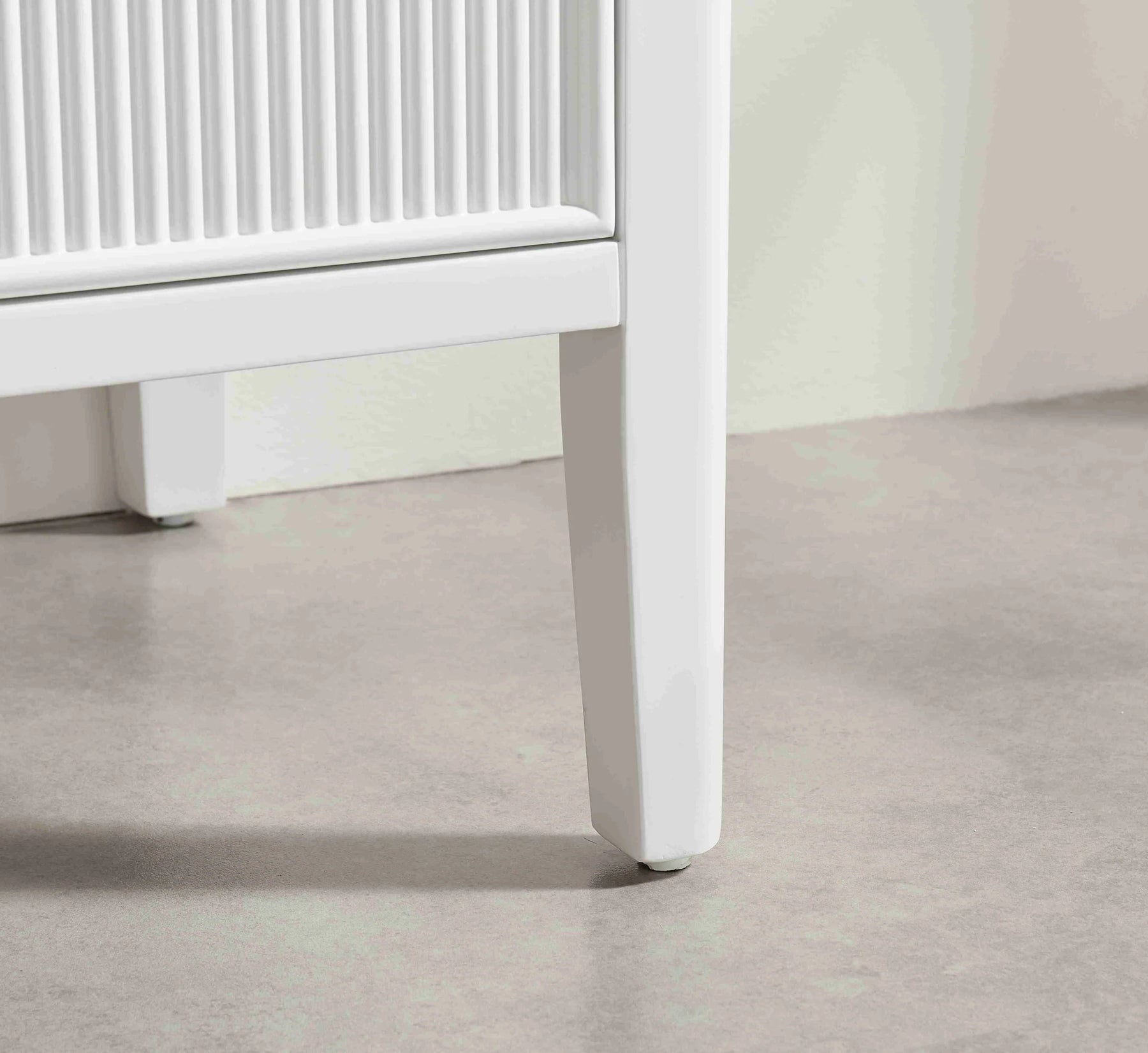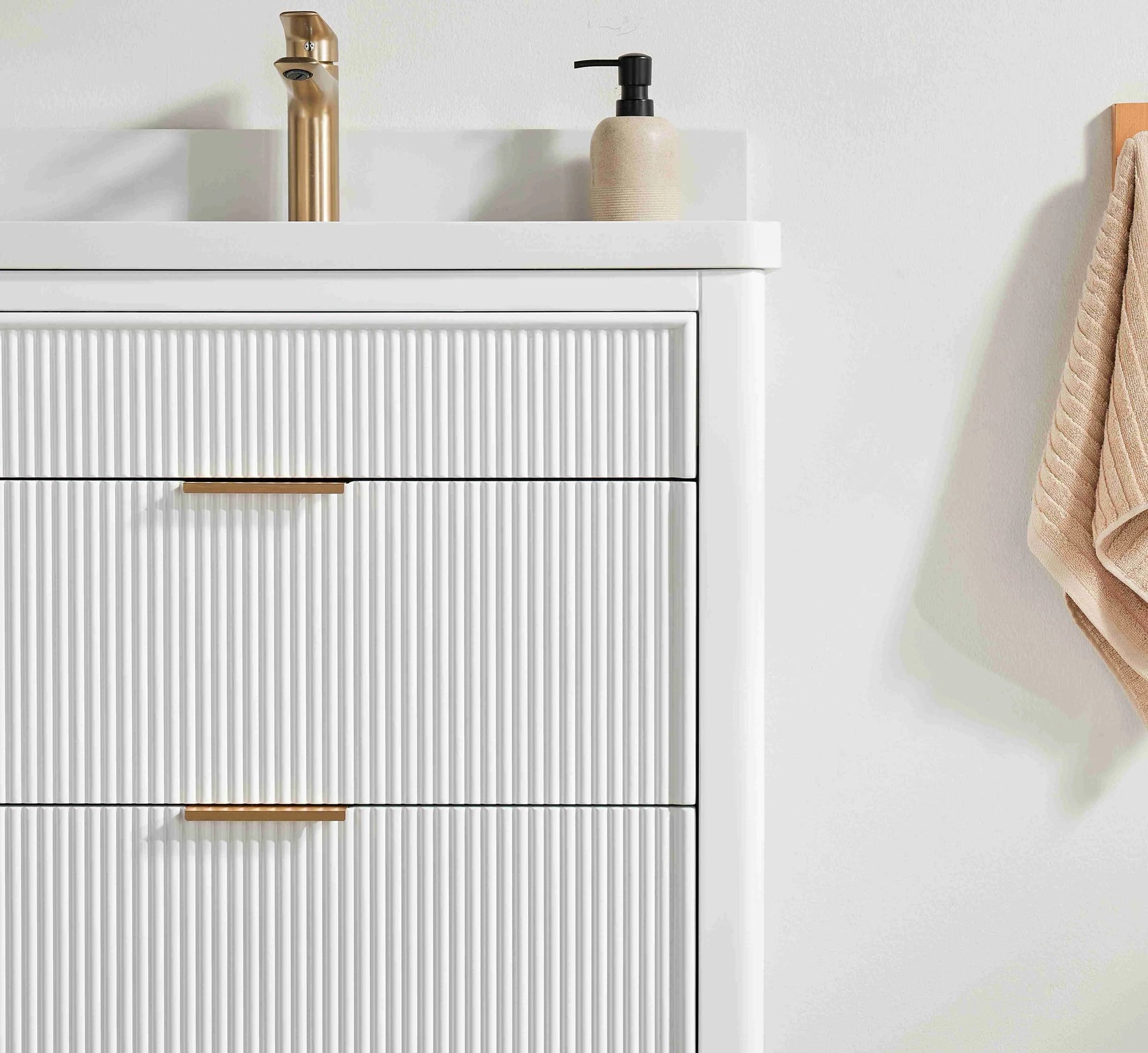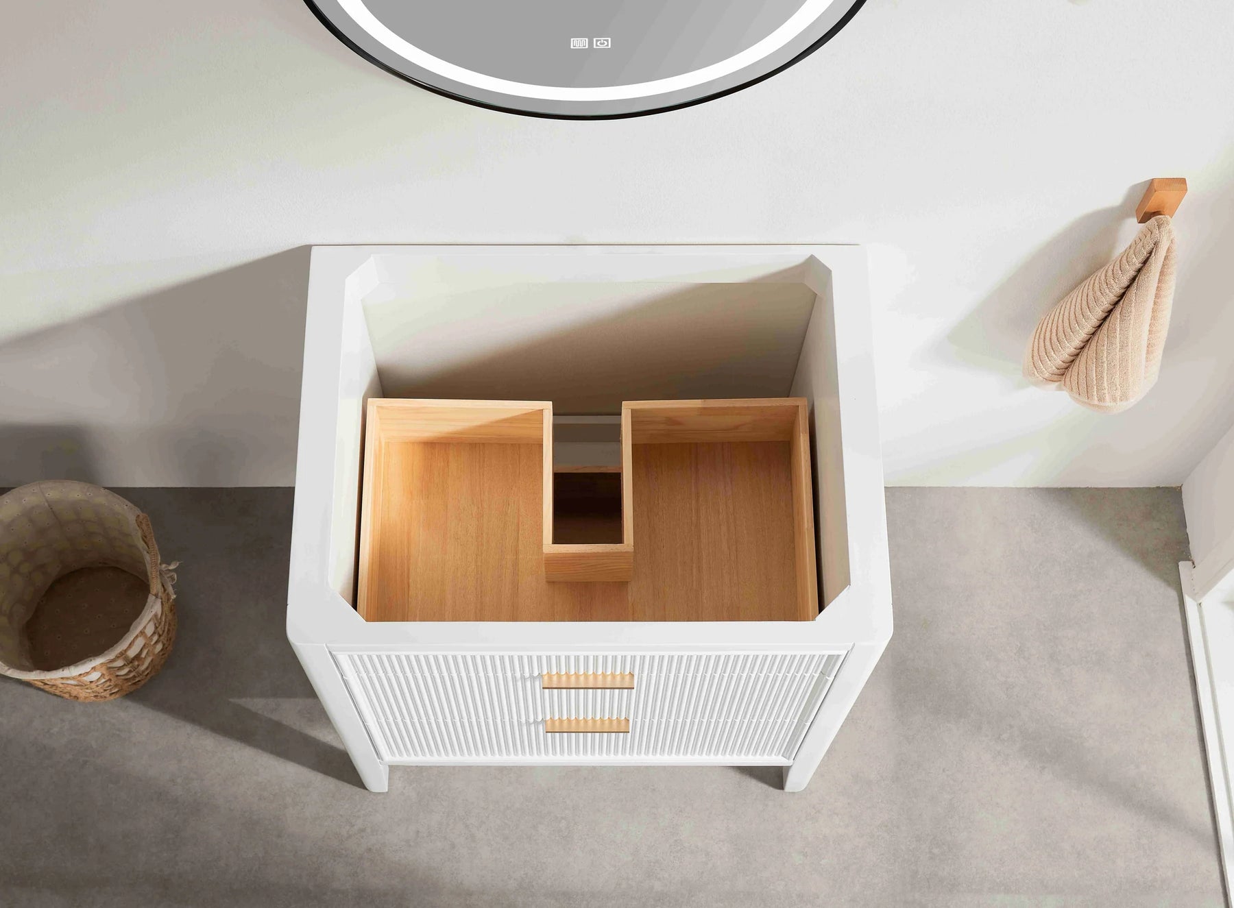 The Liora 36" bathroom vanity features a durable solid wood construction designed to resist moisture and water exposure, ensuring long-lasting performance. Its elegant white finish is complemented by gold hardware for a sophisticated look. Topped with a sleek quartz surface, this vanity combines style and durability, providing a high-quality centerpiece for your bathroom. Premium hardware guarantees reliable functionality, making it an expert choice for both design and practicality.
