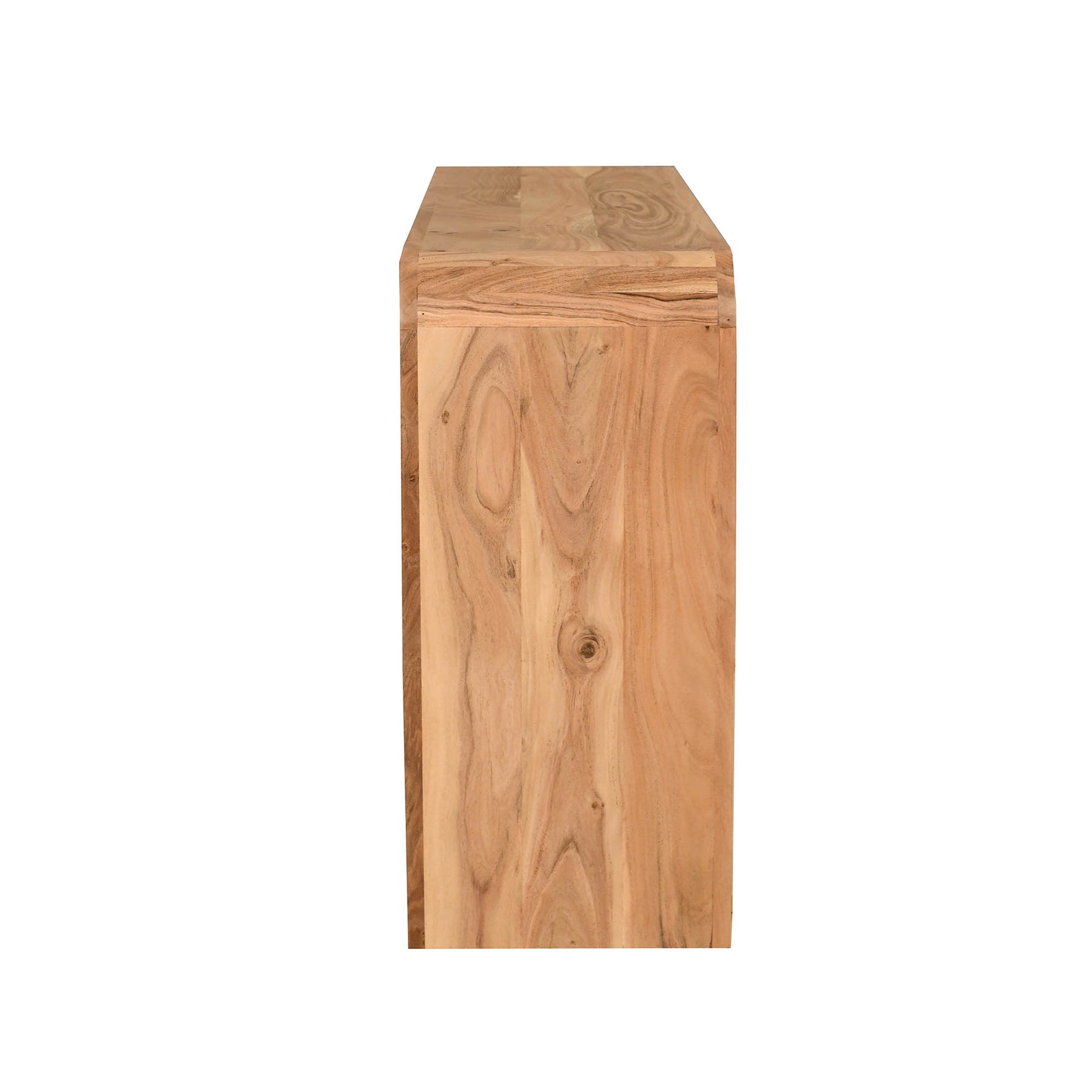 The Cove Console Table is a bold yet refined piece designed for modern interiors. Crafted from solid acacia wood, its sculpted corners and compact form highlight expert craftsmanship while allowing the natural wood grain to take center stage.