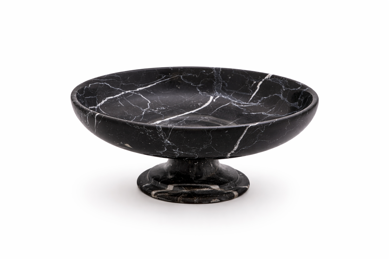 The Aurelius Black Marble Pedestal Bowl – Large is a sculptural statement piece crafted from solid black marble, defined by dramatic natural veining and a refined pedestal base. Its elevated form and generous proportions make it ideal as a centerpiece on dining tables, consoles, or coffee tables.