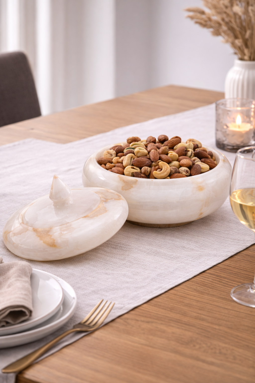 Perfect for styling on coffee tables, dining tables, or consoles, it can be used to store small essentials or styled purely as an art object. Each piece is individually carved from solid stone, making every jar one of a kind in tone, pattern, and character.