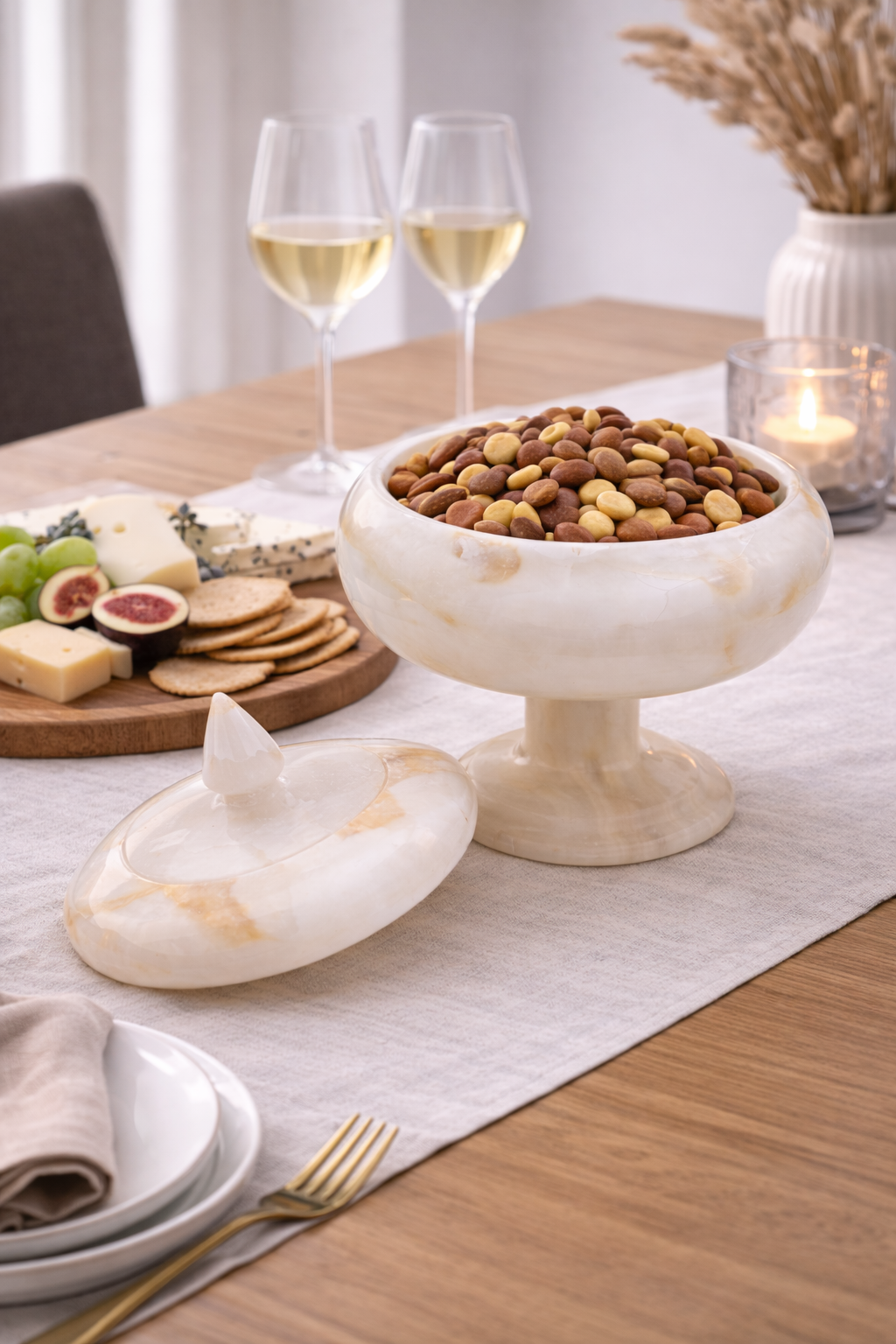 The Aurelius Ivory Onyx Pedestal Jar is a refined decorative vessel carved from natural ivory onyx stone, celebrated for its soft translucency and organic veining. Featuring a sculptural pedestal base and a delicately tapered lid, this piece blends classical form with modern elegance.